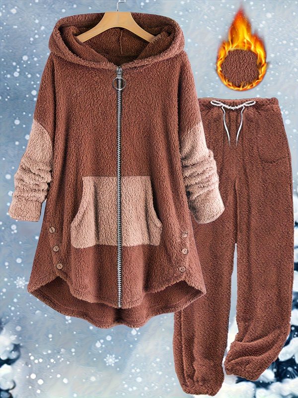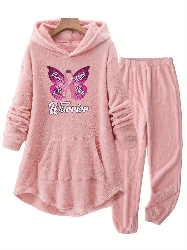 Cozy Plus Size Women’s Fleece Lounge Set with Pink Butterfly & Letter Print – Hooded Top & Pants, Machine Washable