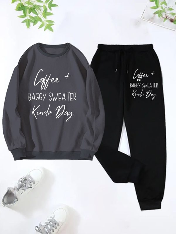 COFFEE Letters Print Women’s Plus Size Suit, Autumn and Winter Long Sleeve Round Neck Sweatshirt and Pants Set, Casual Sportswear