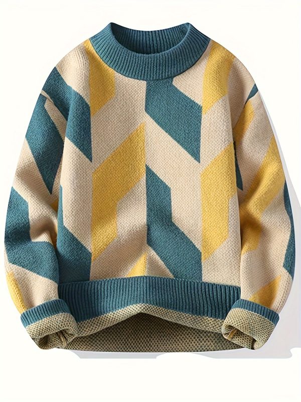 Iron Genghis Selection Men’s Geometric Pattern Sweater – Thick Warm Winter Pullover with Ribbed Cuffs, Stretchy Machine-Washable Round Neck Casual Sweater for Autumn & Winter, Comfortable Knitwear, Thick Knit Fabric