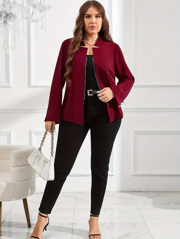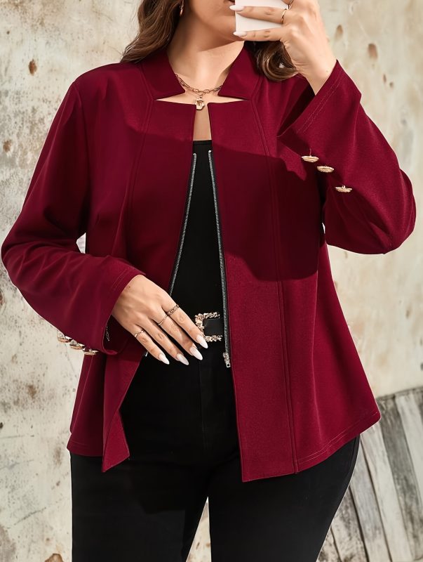 Elegant Plus Size Women’S Solid Color Jacket with Zipper Detail – Comfortable Stretch, Lapel Collar, Perfect for Springu002FFall, Stylish Outdoor Jacket|Minimalist Jacket|Zipper Closure