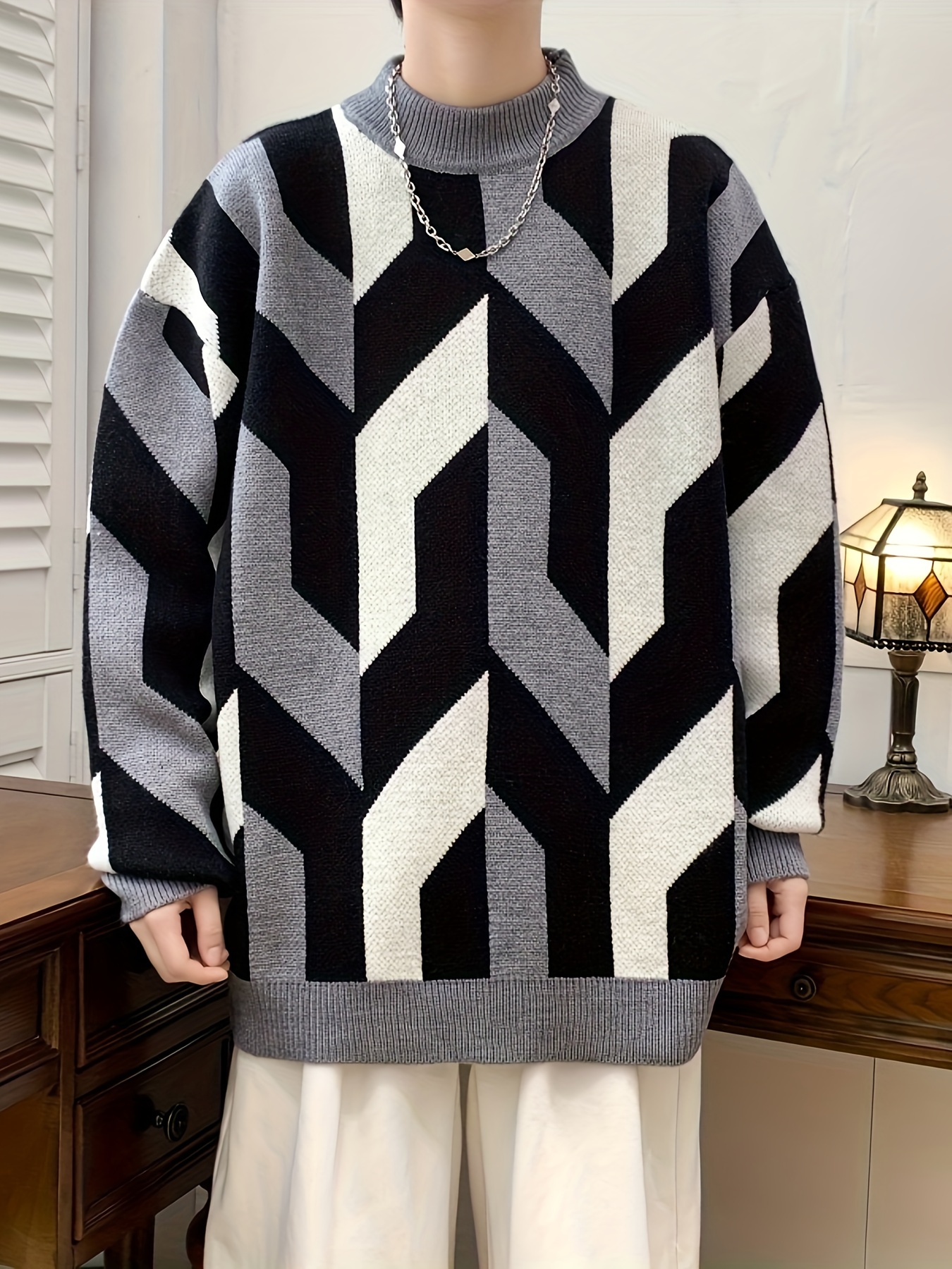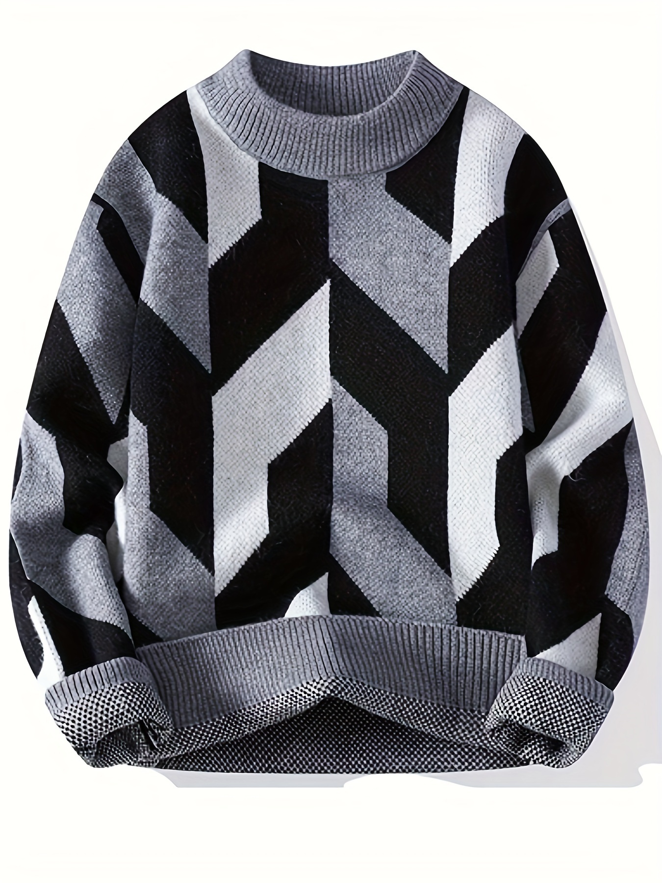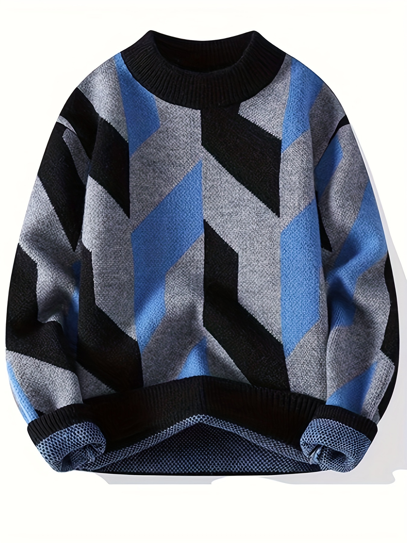 Iron Genghis Selection Men’s Geometric Pattern Sweater – Thick Warm Winter Pullover with Ribbed Cuffs, Stretchy Machine-Washable Round Neck Casual Sweater for Autumn & Winter, Comfortable Knitwear, Thick Knit Fabric