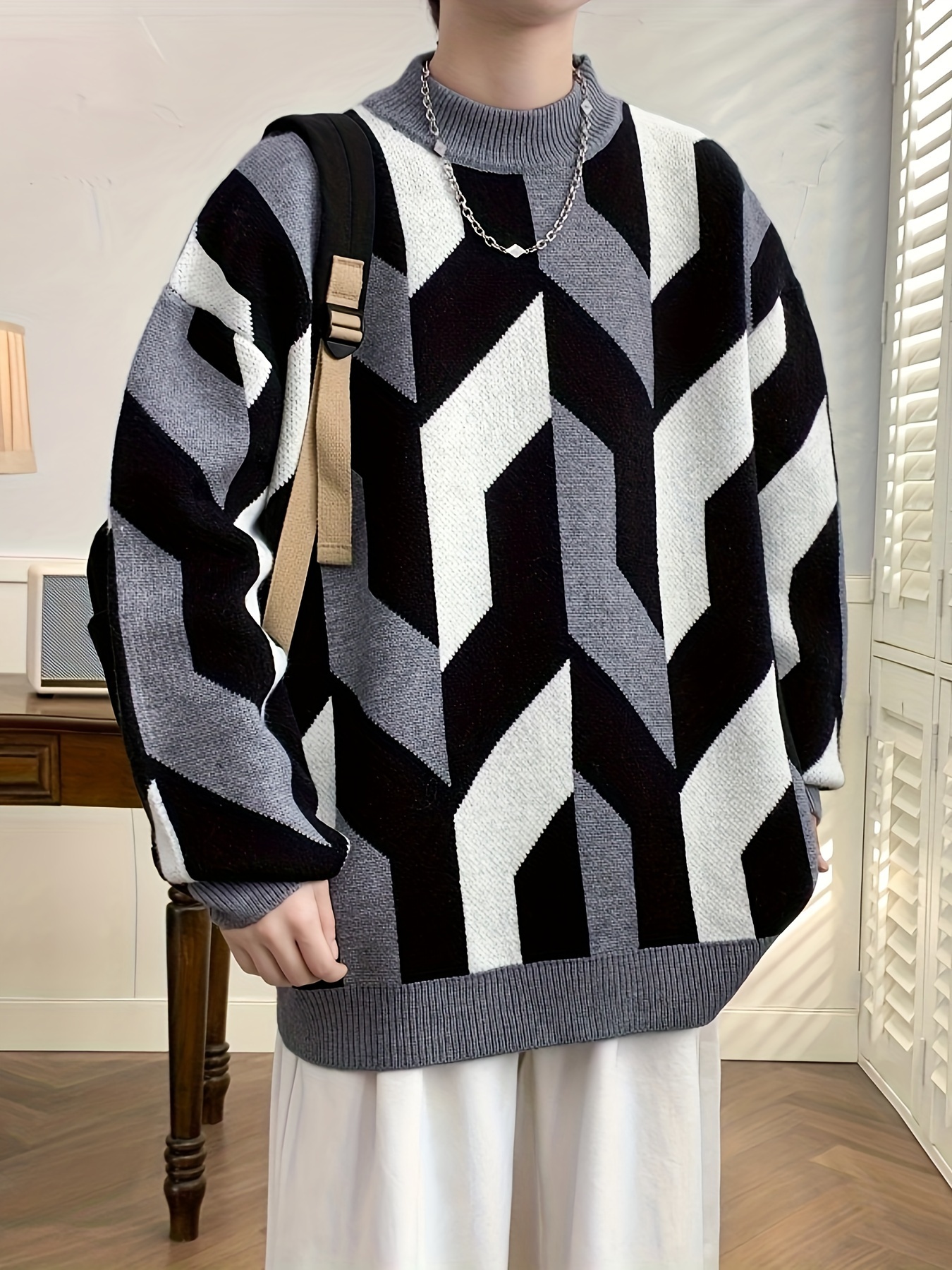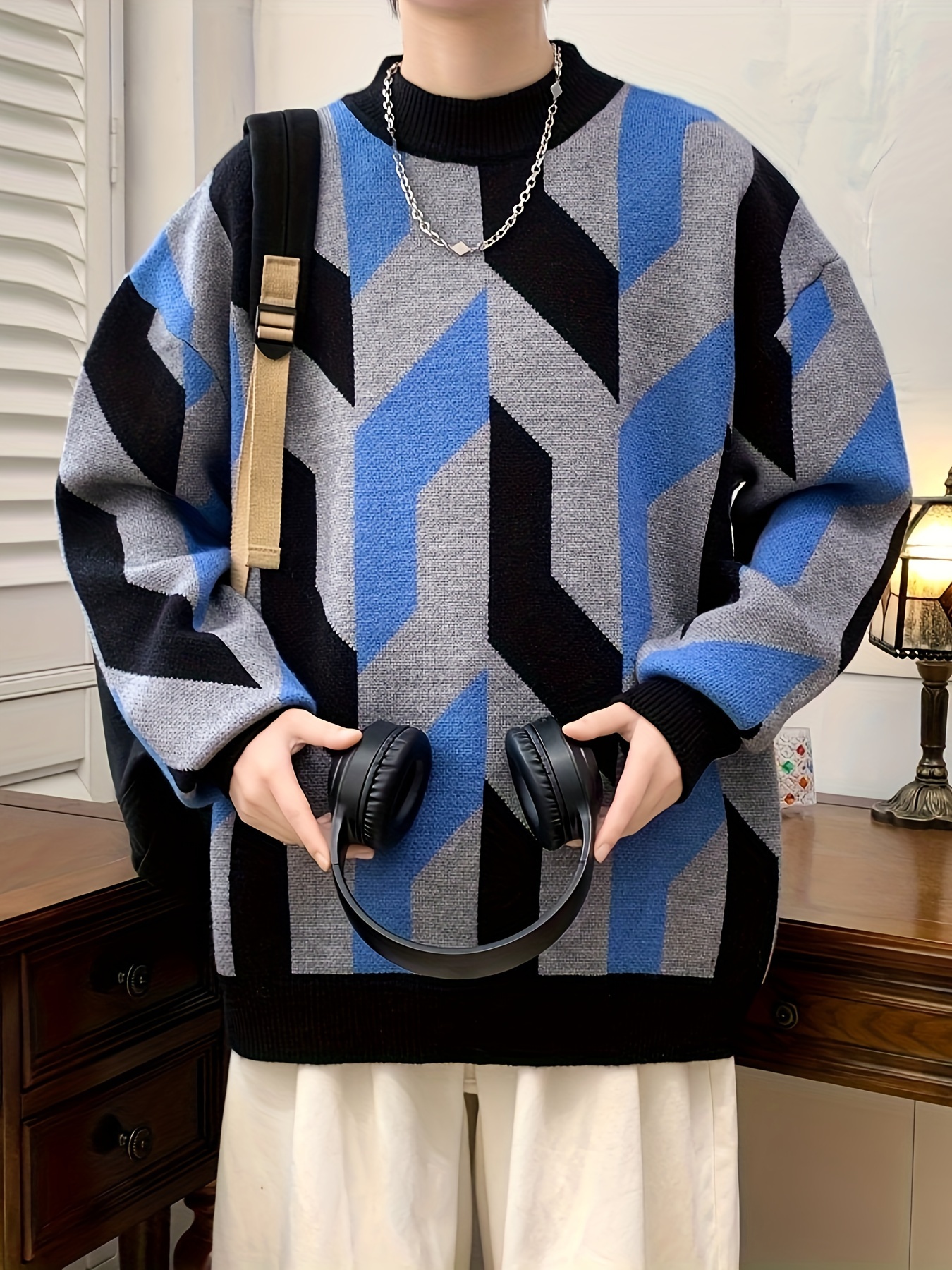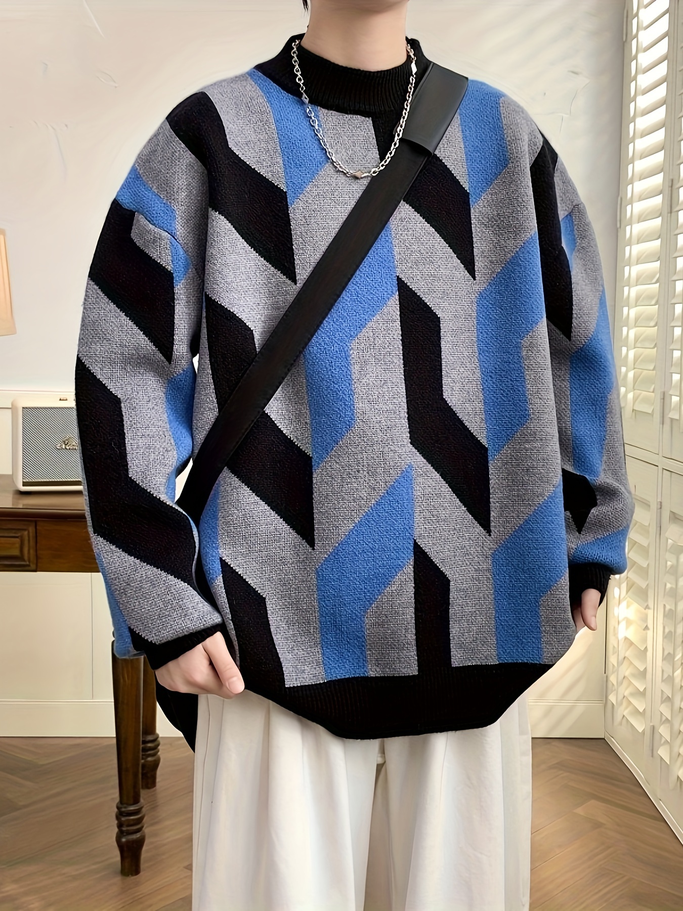 Iron Genghis Selection Men’s Geometric Pattern Sweater – Thick Warm Winter Pullover with Ribbed Cuffs, Stretchy Machine-Washable Round Neck Casual Sweater for Autumn & Winter, Comfortable Knitwear, Thick Knit Fabric