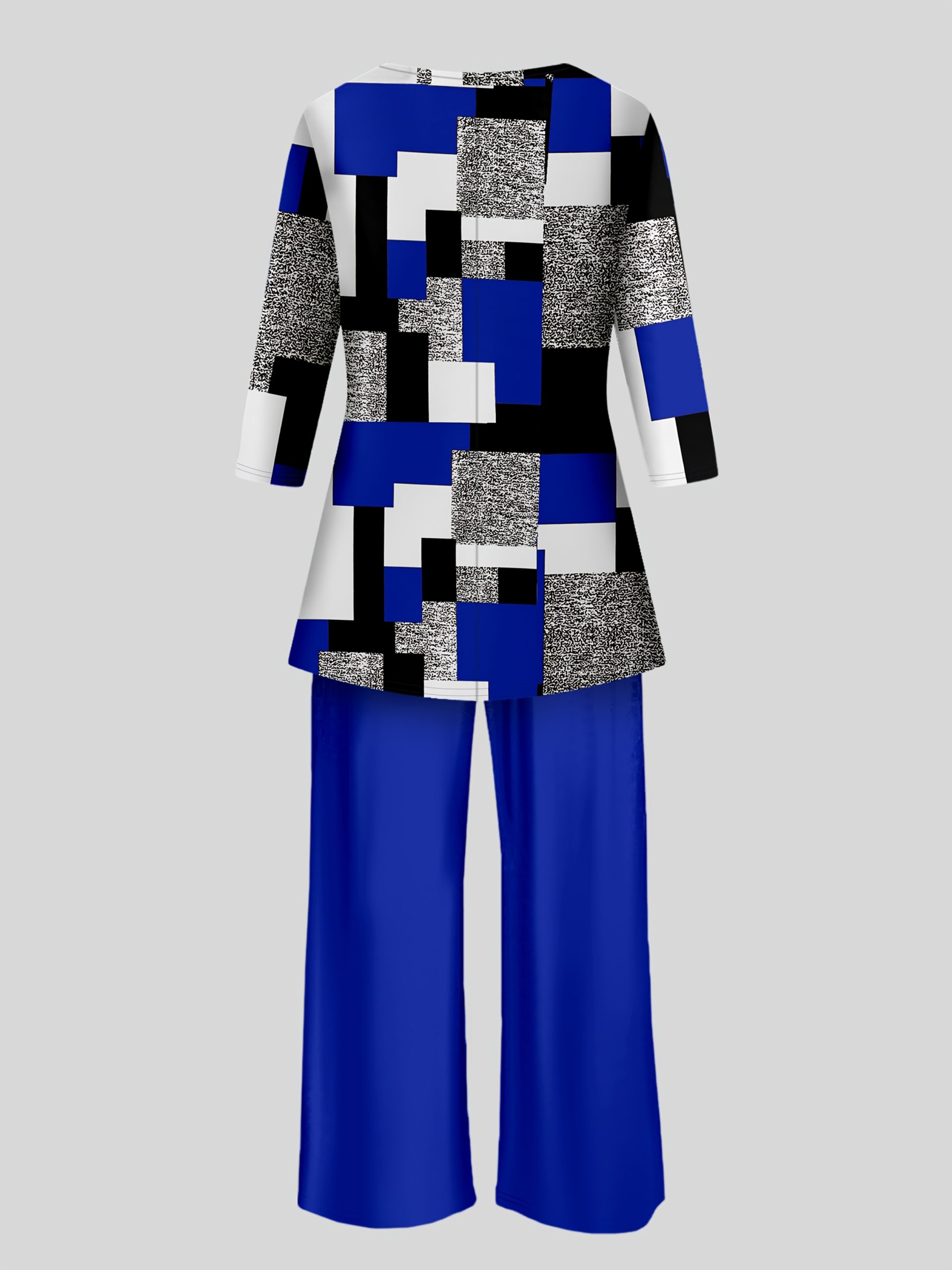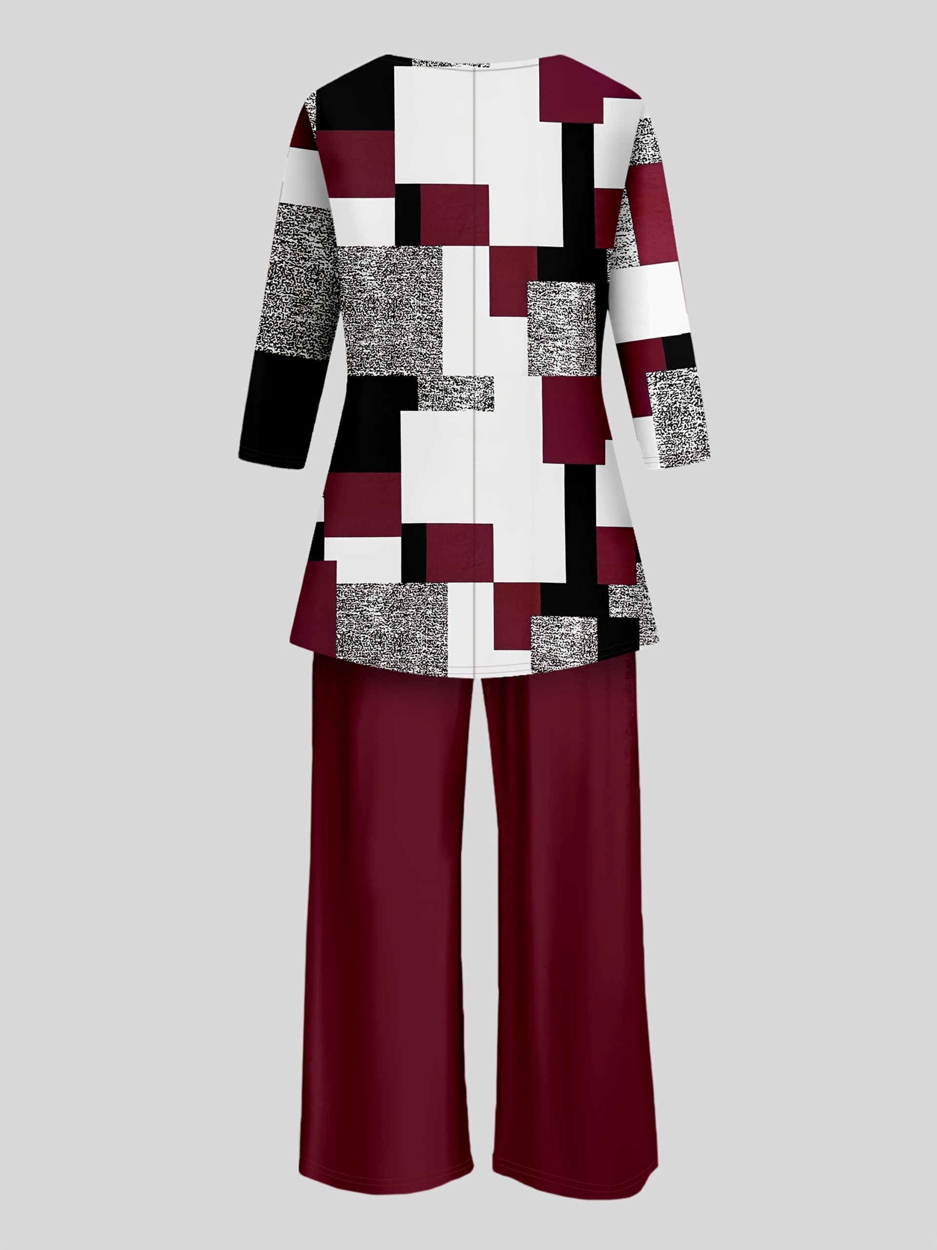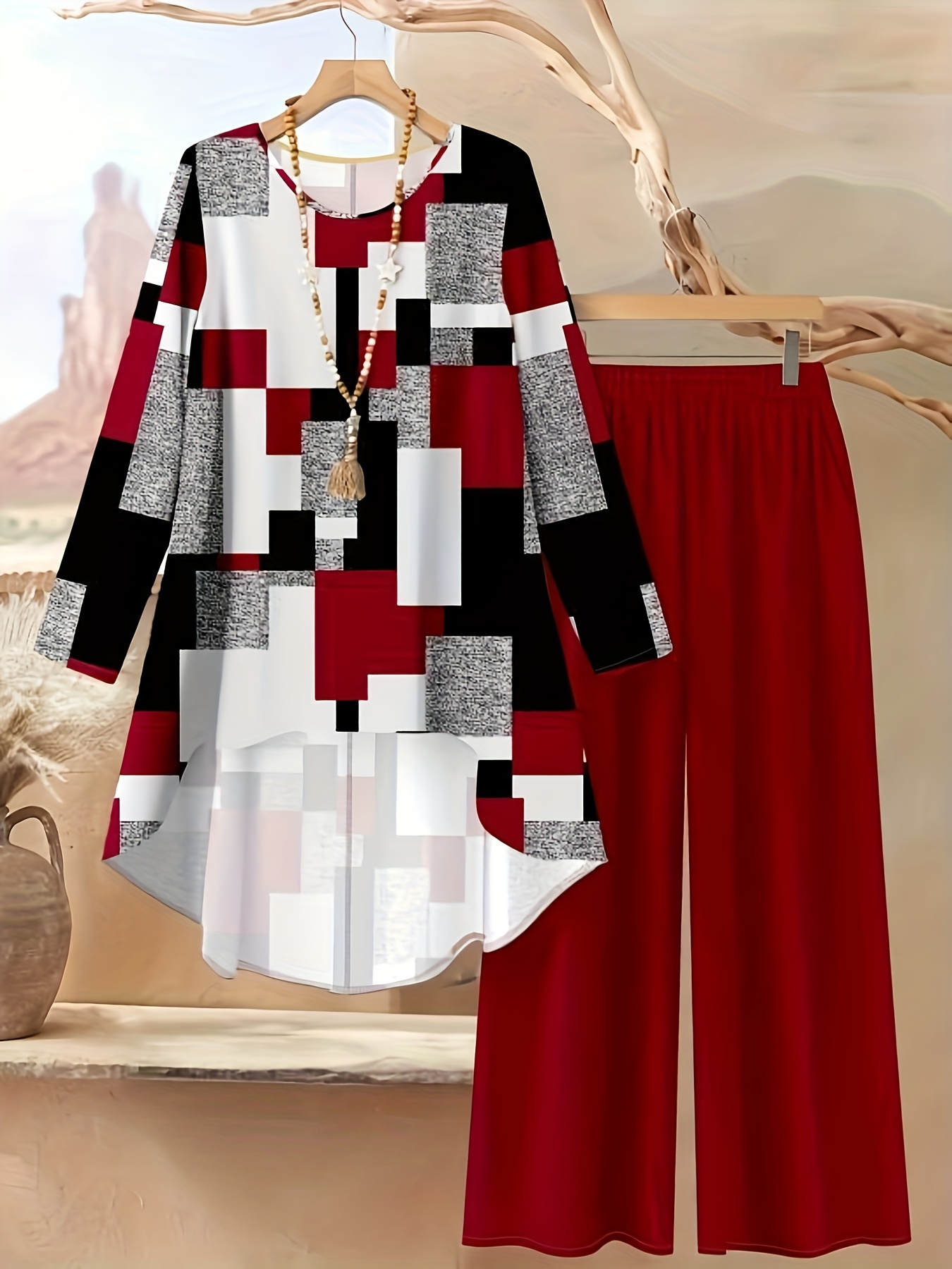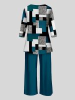 Home Curve Two Pieces Set Plus Size – Plus Size – Plus Size – Plus Size – Elegant Plus Size Women’S Geometric Print Long Sleeve Top & Solid Color Casual Pants Two-Piece Set – High Stretch, Stylish Black & White Checkered Blouse with Ruffled Hem, Wide-Leg Pants, Perfect for Springu002FSummeru002FFall, Casual Attire|Geometric Print Top|Stretchy Fabric