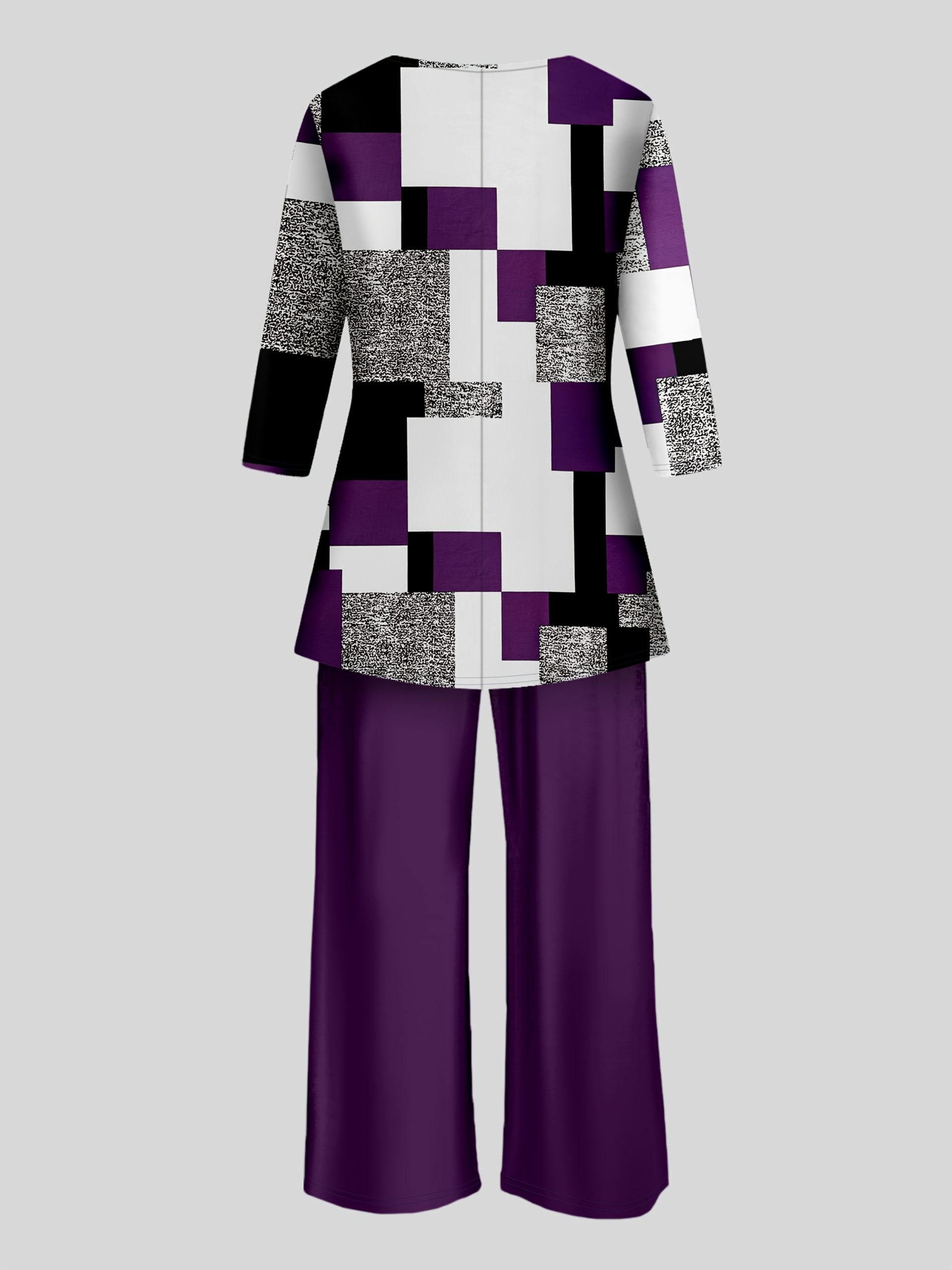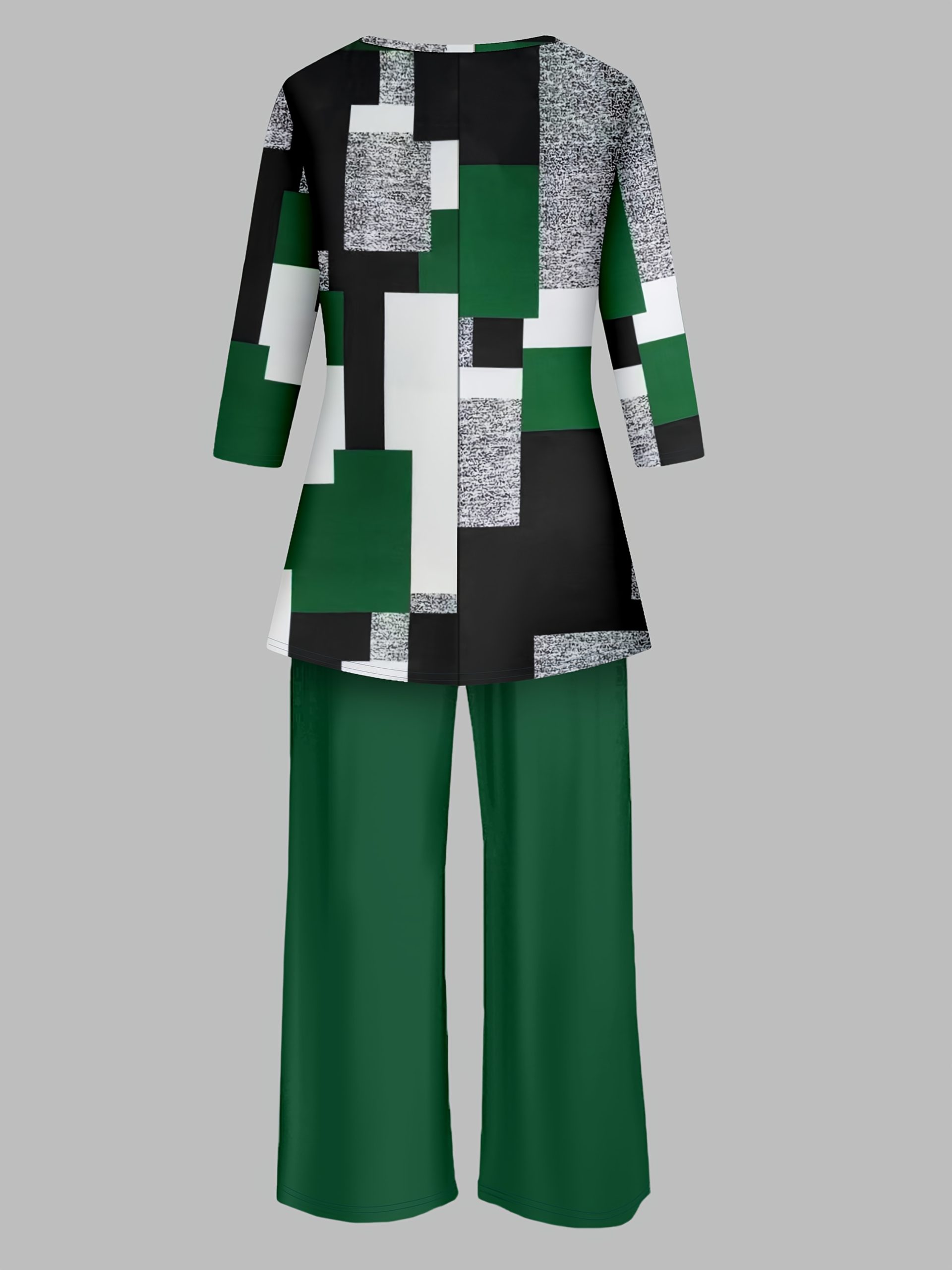 Plus Size – Plus Size – Plus Size – Plus Size – Elegant Plus Size Women’S Geometric Print Long Sleeve Top & Solid Color Casual Pants Two-Piece Set – High Stretch, Stylish Black & White Checkered Blouse with Ruffled Hem, Wide-Leg Pants, Perfect for Springu002FSummeru002FFall, Casual Attire|Geometric Print Top|Stretchy Fabric