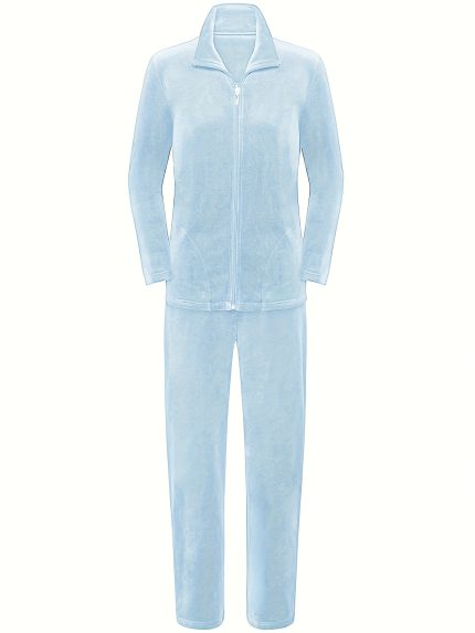 Plus Size, Women’s Plus Size Lapel Zipper Front Long Sleeve Fleece Jacket and Straight Leg Pants Set, Autumnu002FWinter Home Wear Elegant Casual Style Four Seasons Outfit