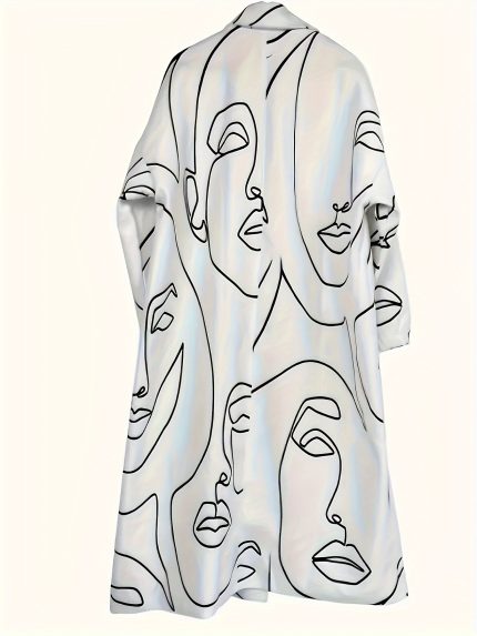 Plus Size Face Sketch Graphic Overcoat, Casual Long Sleeve Lapel Pockets Outwear For Winter, Women’s Plus SizeClothing