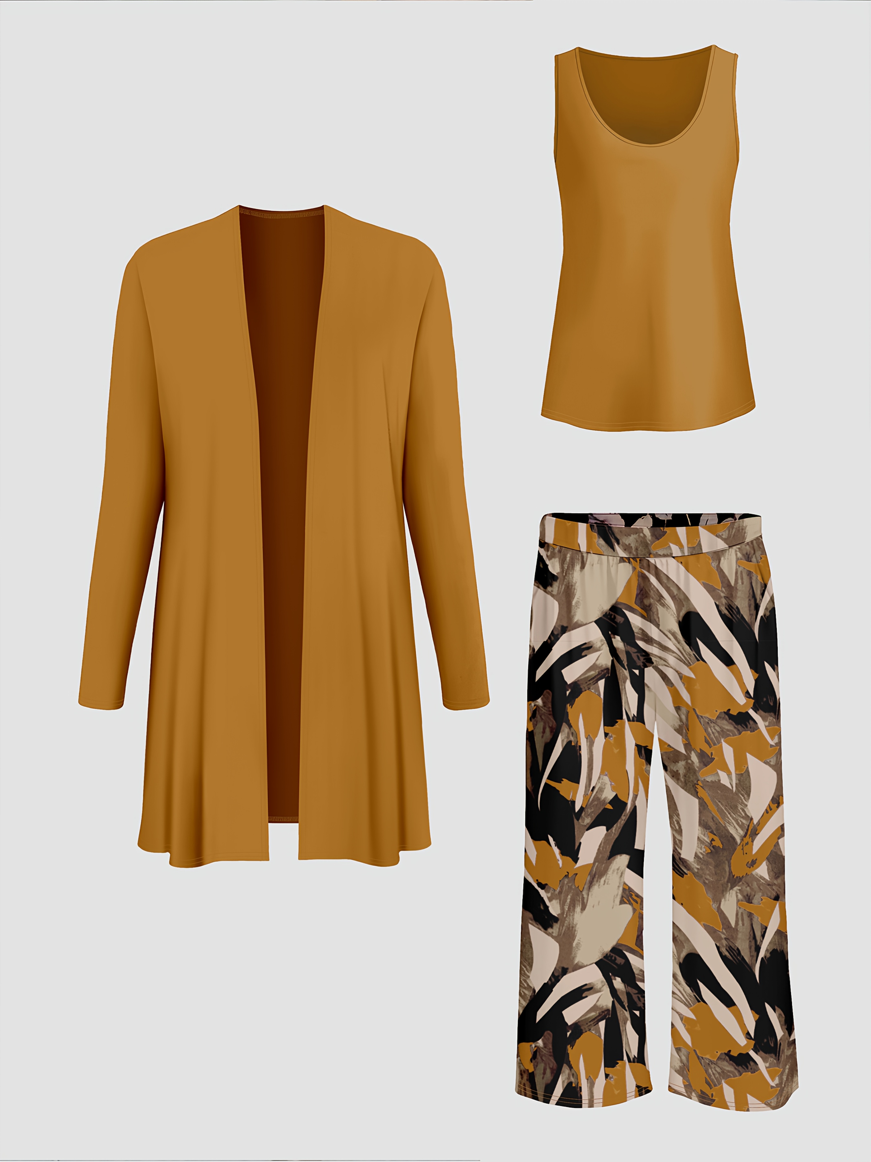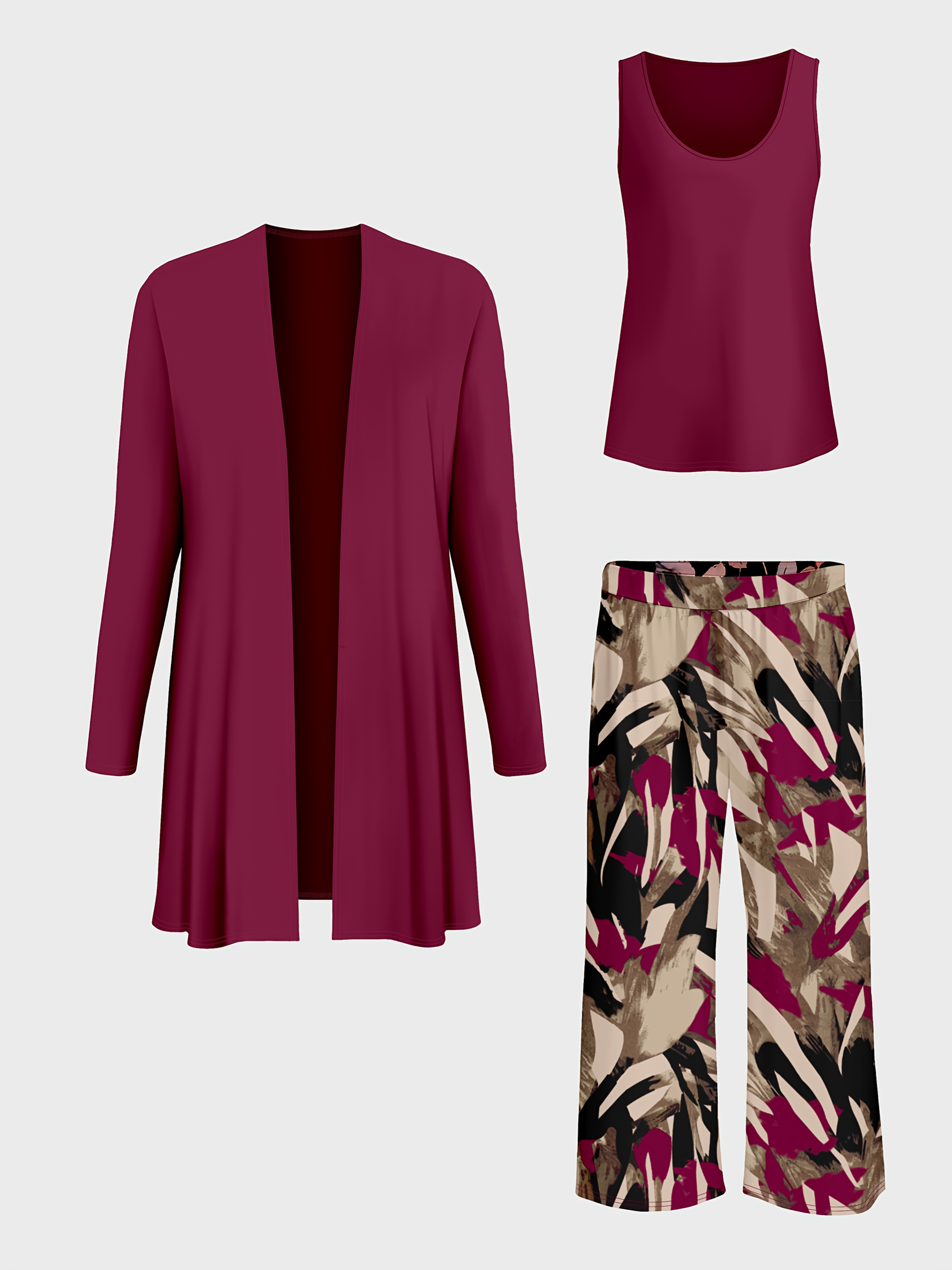 Plus Size – Plus Size – Women’S Plus Size Elegant Solid Color Three-Piece Set with Leaf Print Pants, High Stretch Fabric, Elegant Outerwear and Innerwear, Elegant Attire|Minimalist Style|Stretchy Fabric