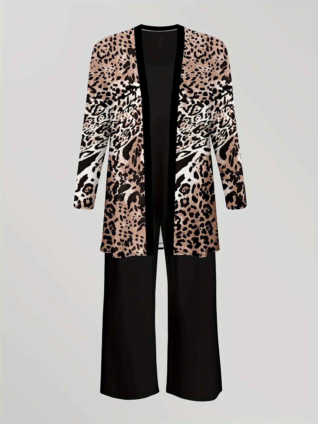 Plus Size - Plus Size - Women'S Plus Size Elegant Solid Color Three-Piece Set with Leaf Print Pants, High Stretch Fabric, Elegant Outerwear and Innerwear, Elegant Attire|Minimalist Style|Stretchy Fabric $39.34