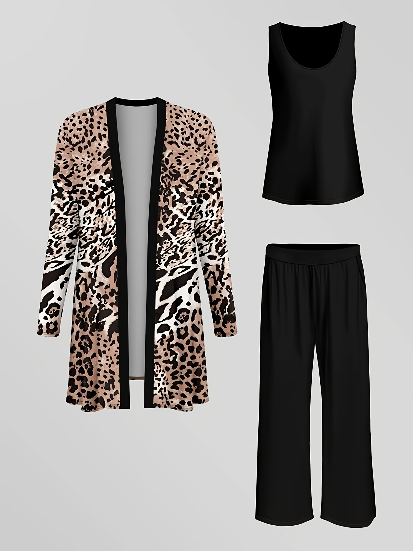 Plus Size - Plus Size - Women'S Plus Size Elegant Solid Color Three-Piece Set with Leaf Print Pants, High Stretch Fabric, Elegant Outerwear and Innerwear, Elegant Attire|Minimalist Style|Stretchy Fabric