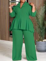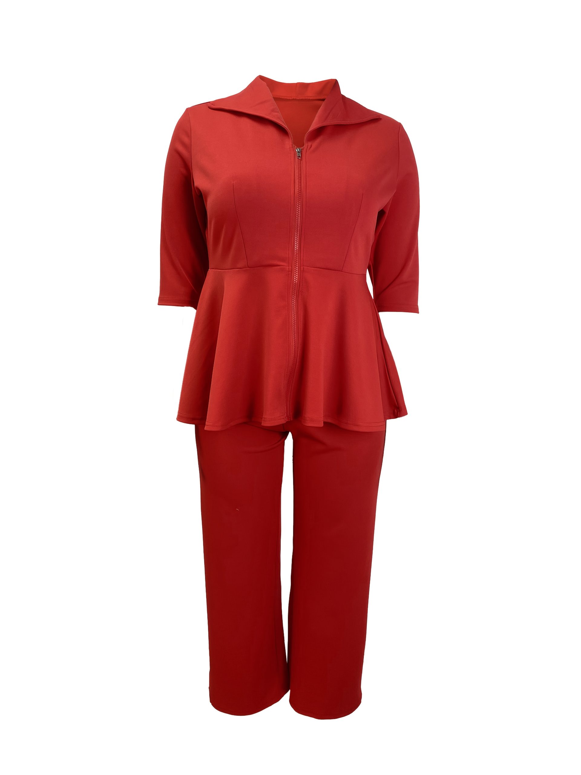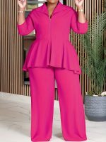 Home Curve Two Pieces Set TB6561 Stylish Commuting Long-Sleeve Collared Zip-Up Top with Wide-Leg Pants in Solid Color Set