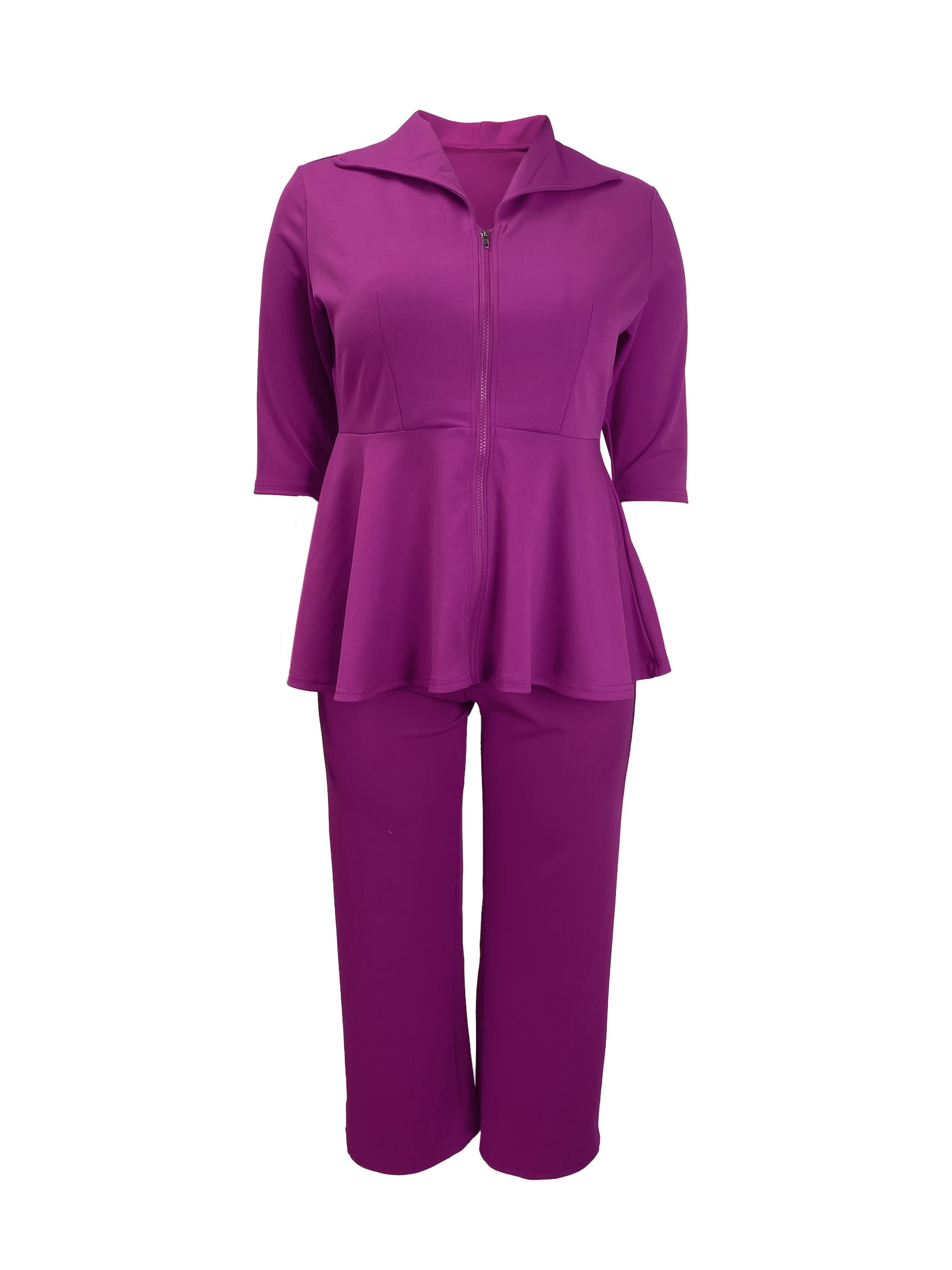 Plus Size, Women’s Plus Size Lapel Zipper Front Long Sleeve Fleece Jacket and Straight Leg Pants Set, Autumnu002FWinter Home Wear Elegant Casual Style Four Seasons Outfit