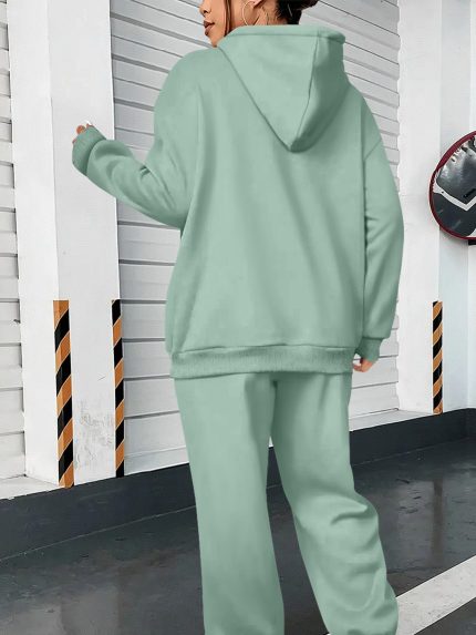 Plus Size – Women’S Plus Size Casual Hoodie & Sweatpants Set – Light Green, Comfortable Stretch Fabric, Drawstring Hoodie with Kangaroo Pocket, Loose Fit Sweatpants, Casual Wear|Relaxed Fit|Stretchy Fabric
