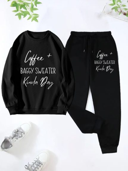 COFFEE Letters Print Women’s Plus Size Suit, Autumn and Winter Long Sleeve Round Neck Sweatshirt and Pants Set, Casual Sportswear