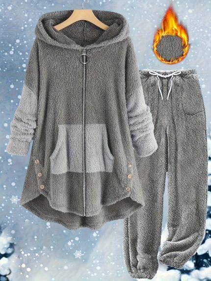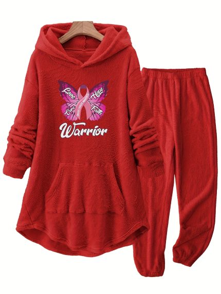 Cozy Plus Size Women’s Fleece Lounge Set with Pink Butterfly & Letter Print – Hooded Top & Pants, Machine Washable